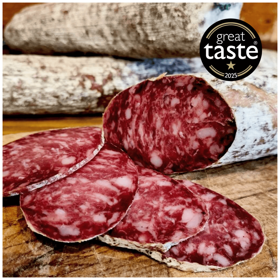Salchichón de cerdo artesano, elaborado con ingredientes naturales de gran calidad, manteniendo la tradición en la elaboración artesanal del embutido casero. Curación en secadero natural. Adquiera aquí su salchichón de cerdo artesano casero online.